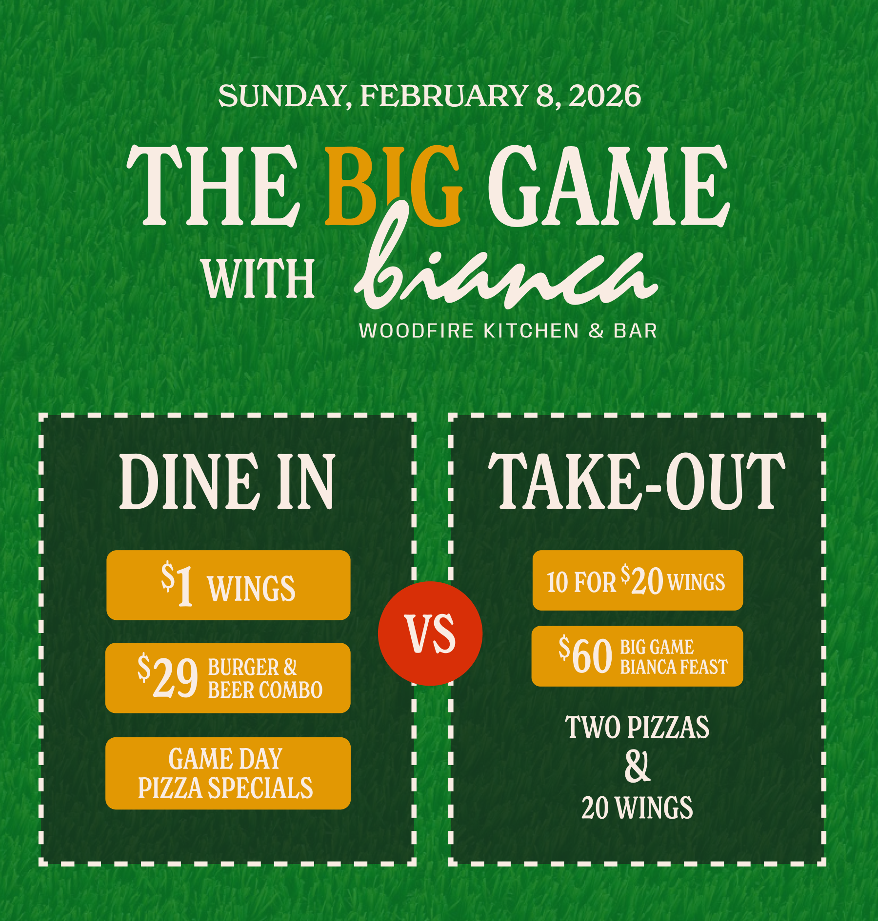 Wings, pizzas, burgers, and cold beer—whether you’re here or hosting at home, Bianca's got you covered.